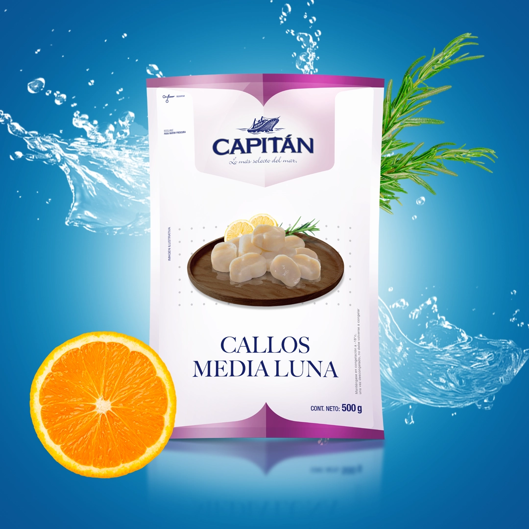 “Disfruta los frescos y deliciosos callos media luna de la marca Capitán, ricos en proteínas y perfectos para ceviches y ensaladas. ¡Añade sabor y salud a tus platos!”