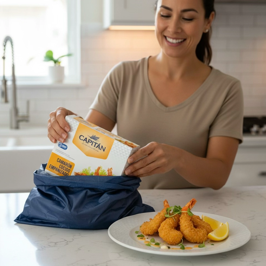 El Camarón Cocido Empanizado Capitán es la forma más sencilla de llevar una botana tipo restaurante a tu mesa sin esfuerzo. La presentación de 255 g reúne piezas tamaño 21/25 con cola visible para un emplatado atractivo; el empanizado se dora de manera uniforme y mantiene un centro jugoso gracias a su cocción previa. ¿Resultado? Textura crujiente por fuera y suavidad por dentro en cuestión de minutos.