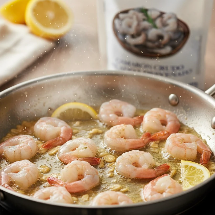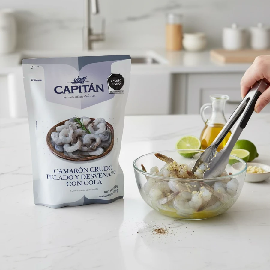 Con Capitán, obtienes consistencia y seguridad: cadena de frío cuidada, selección de talla y limpieza impecable. Además, su formato pelado ahorra tiempo de preparación, evitando mermas y permitiendo controlar el punto exacto de cocción (cuando toma color rosa opaco y se curva suavemente).