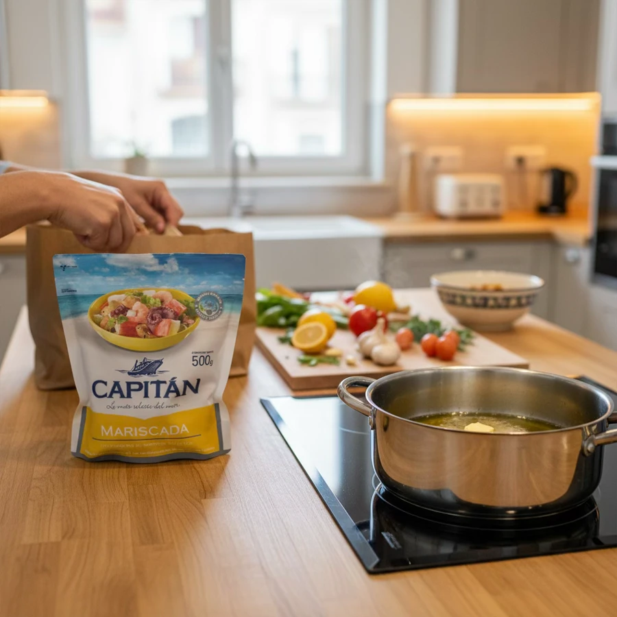 Como toda la línea Capitán, este producto se beneficia de cadena de frío controlada y procesos estandarizados que cuidan la frescura desde origen hasta tu cocina. Eso se nota al cocinar: piezas que no se encogen en exceso, sabores limpios y una mezcla que se integra de forma armónica en salsas ligeras, arroces caldosos, pastas, paellas exprés o tostadas de mariscos.