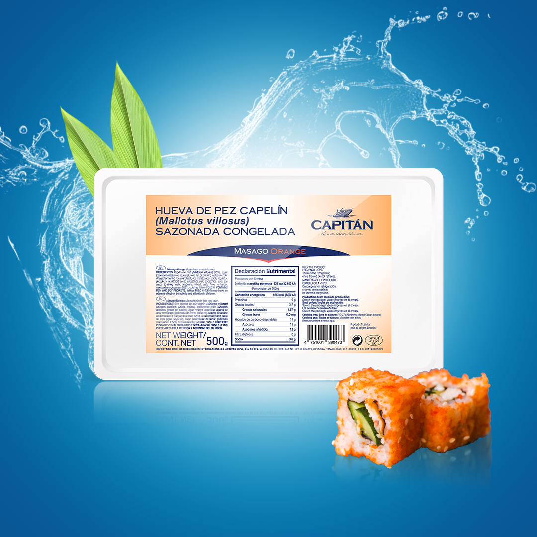 “Eleva tus platillos con el toque sofisticado del Masago Orange de la marca Capitán. Deléitate con su textura crujiente y sabor único, ideal para sushi y más.”