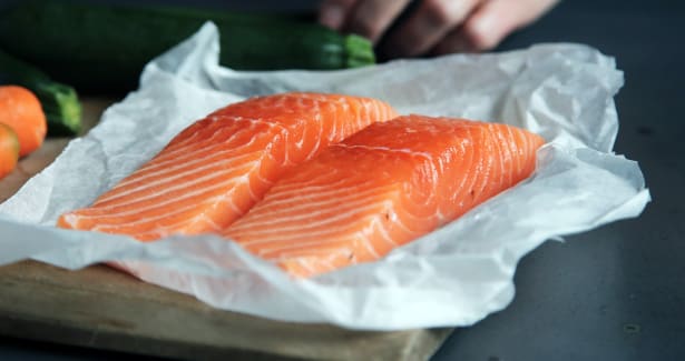2. Coloca los filetes de salmón en una bandeja para hornear con papel aluminio o pergamino.