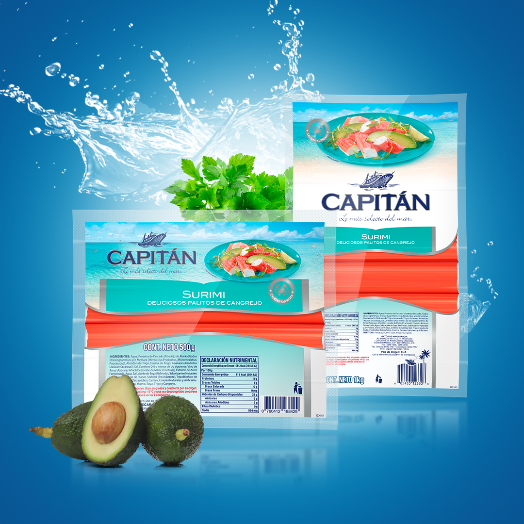“Disfruta del sabor fresco y saludable del Surimi Capitán. Rico en proteínas, bajo en grasas y perfecto para tus recetas favoritas. ¡Prueba su versatilidad hoy mismo!”